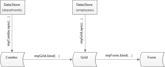 myCombo.sync(departments);// to load data to the combo myGrid.sync(employees); // to load data to the grid